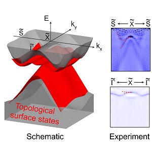 图2. TaSe3拓扑表面态的动量空间示意(红色曲面)及沿高对称方向的实验数据(红色虚线标记)。