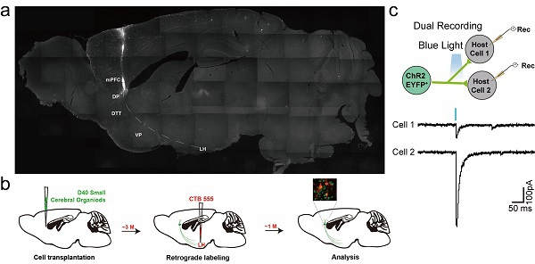 近日,我校生命学院何水金课题组与南京医科大学刘妍课题组合作,首次报道了移植的微型人源大脑类器官(small human cerebral organoids)在小鼠的前额叶皮质内侧区(medial prefrontal cortex, mPFC),不仅可与宿主大脑建立远距离的长投射连接,并增强了小鼠的恐惧记忆能力。该研究扩展了微型类脑器官的潜在治疗价值,也为理解类器官参与宿主大脑建立神经网络连接提供新的依据。