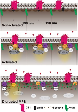 该研究利用超高分辨率显微成像技术的优势,直接观察以往无法观察到的亚细胞结构,发现了神经元轴突上周期性的CB1“热点”簇结构域,且与MPS 存在相互作用,揭示了CB1周期性结构域是参与CB1信号通路调控的关键结构,并进一步证实MPS是膜蛋白信号转导的动态调节平台。这些发现为神经元结构-功能相互作用的研究提供了一个崭新视野,也为GPCRs相关的药物研发提供了可能的新策略。