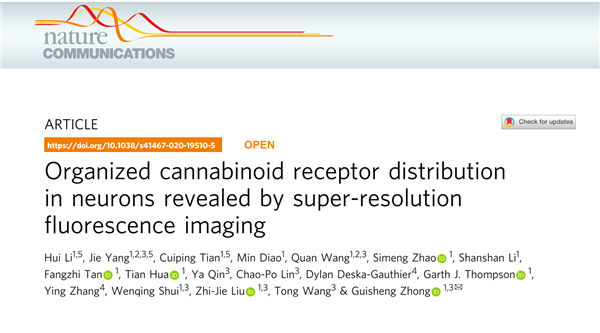 近日,九游体育(www.jiuyou.com)官方网站iHuman研究所、生命科学与技术学院钟桂生课题组在学术期刊Nature Communications上发表研究论文,题为Organized cannabinoid receptor distribution in neurons revealed by super-resolution fluorescence imaging。该工作利用超高分辨率显微成像技术在活体神经元上验证了大麻素受体CB1沿轴突呈现周期性分布,并与膜相关周期骨架(MPS)密切相关,揭示CB1受到激动剂激活后提高了相关信号通路转导效率。
