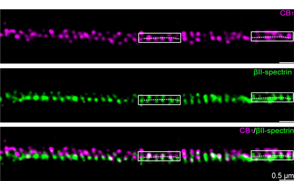 近年来颇受关注的超高分辨率显微成像技术不仅突破了光学成像中的衍射极限的限制,把传统成像的分辨率提高了10-20倍,达到了纳米量级的分辨率,而且这些成像手段在观察细胞内的蛋白以及其他分子的精细结构和定位中具备其它方法无法比拟的优势,为研究蛋白在细胞中的结构和功能提供了极佳的观测条件。钟桂生课题组采用受激发射损耗(STED)显微成像技术,系统地研究了CB1在脑组织和原代培养神经元中的纳米结构,发现CB1簇形成间距约190 nm的“热点”,周期性地排布在轴突上。另外,课题组还通过结合双色STED 成像及其他生化细胞技术证实CB1“热点”与MPS存在相互作用。