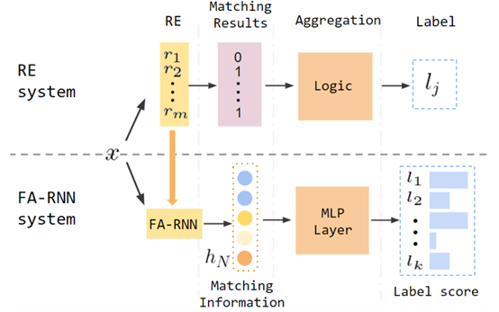 在主会论文Cold-start and Interpretability: Turning Regular Expressions into Trainable Recurrent Neural Networks中,课题组提出了一种将正则表达式转化为循环神经网络的方法。正则表达式是自然语言处理领域最常用的符号规则形式之一,有着较高的可解释性以及精确率,却无法像神经网络一样由数据训练从而提升效果。相较而言,神经网络在有足够多标注数据的情况下往往效果惊人,但当标注数据匮乏时性能就会大打折扣。此外,神经网络也缺少可解释性以及难以融入外部知识。屠可伟课题组将正则表达式对应的有限状态自动机转化为一种可学习的循环神经网络,以结合符号规则与神经网络的优点。在文本分类任务上的实验表明,正则表达式转化而成的循环神经网络在零样本时有着和正则表达式相当的准确率,远高于随机初始化的神经网络;在小样本的场景下也有着明显优势;在样本足够多的场景下则有着和神经网络相当的效果。屠可伟课题组2019级硕士生蒋承越是本文第一作者,乐言科技为合作单位,屠可伟教授为通讯作者。项目获得乐言科技和国家自然科学基金委支持。