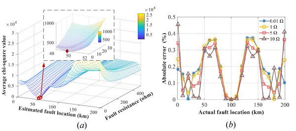 图3. 所提出方法在柔性直流电网线路中的故障定位结果 (a)一致性指标结果,0.01欧姆故障电阻、50公里处正极接地故障(曲面最低点对应真实故障位置)(b) 故障定位误差,不同故障电阻、不同故障位置的正极接地故障