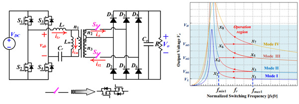 图4. 提出基于可变变比变压器和可重构桥谐振变换器拓扑及不同模态和频率下的电压增益