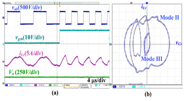 在电动汽车车载充电领域,由于电池状态不同,电池的端电压可以在很宽的范围内变化。如何适配这种超宽输出电压,并为电池提供安全高效的充电方案,是电动汽车充电技术的一个研究重点。王浩宇课题组提出一种可变变压器变比和可重构桥的新型谐振变换拓扑,如图4所示。该拓扑引入一个可通过开关控制的变匝比变压器以及利用原边的可重构桥结构,通过合理设计变压器原副边匝数,可以有效的拓宽变换器的增益(60-450V)。与传统方案相比,该变换器可以在不同变压器变比下工作,最优变压器变比可以通过拉格朗日乘子法以及KKT条件获得,在输出电压极低的情况下,原边可工作在半桥模式,从而极大减小增益对励磁电感和开关频率范围的需求。可显著减小变换器的导通损耗和开关损耗,提高变换器的效率。同时,通过所提出的同步跳频技术,可以实现不同模态间的顺滑切换,如图5所示。