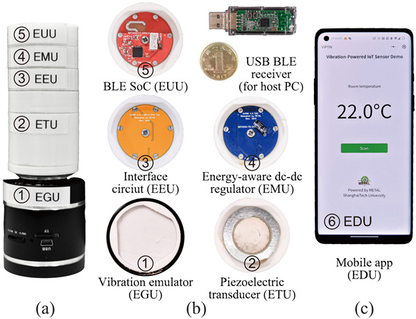 图1. ViPSN振动供能物联网传感器开发原型。(a) 装配图。(b) 硬件组成部件。(c) 蓝牙接收演示终端。