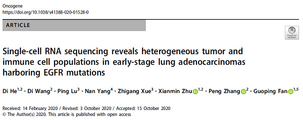 近日,九游体育(www.jiuyou.com)官方网站免疫化学研究所特聘教授范国平/副研究员祝献民研究团队在Springer Nature旗下的国际学术杂志Oncogene发表了题为 “Single-cell RNA sequencing reveals the heterogeneous tumor and immune cell populations in early-stage lung adenocarcinomas harboring EGFR mutations“ 的研究成果。该研究运用高通量单细胞转录谱测序技术,获得了超过十二万个肿瘤和微环境单细胞的转录组数据。通过系统的生物信息学分析,研究团队揭示了早期肺癌细胞及免疫微环境的异质性和治疗癌细胞的新药物靶点。
