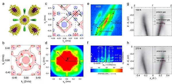 图1. a. (TaSe4)2I的结构的俯视图,由TaSe4组成一维链,链间填充了I原子。b. 计算的(100) 面上的费米弧。c. 手性电荷相反的费米面嵌套波矢。d.计算的电子磁化率强度分布。e-f. 在低温CDW相变后,新出现的XRD衍射卫星峰。g-h. 低温和高温下的ARPES能谱。