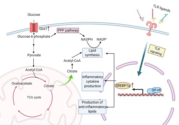 近年研究显示巨噬细胞的功能与细胞代谢密切相关。脂质不但是细胞的重要营养物质,还是巨噬细胞激活和功能的重要调控因子。有研究显示巨噬细胞的脂代谢能够调控巨噬细胞的吞噬作用及炎症因子的产生。细胞内的脂滴,除了用于储存胞内多余的脂质,还能够调控巨噬细胞的吞噬作用和脂质介导因子(如白细胞三烯和前列腺素)的产生。此外,胆固醇合成通路中的多个代谢中间产物则能够调控巨噬细胞炎症因子的产生以及抗病毒功能。巨噬细胞脂代谢功能的失调则与动脉粥样硬化和肥胖等多种疾病相关。