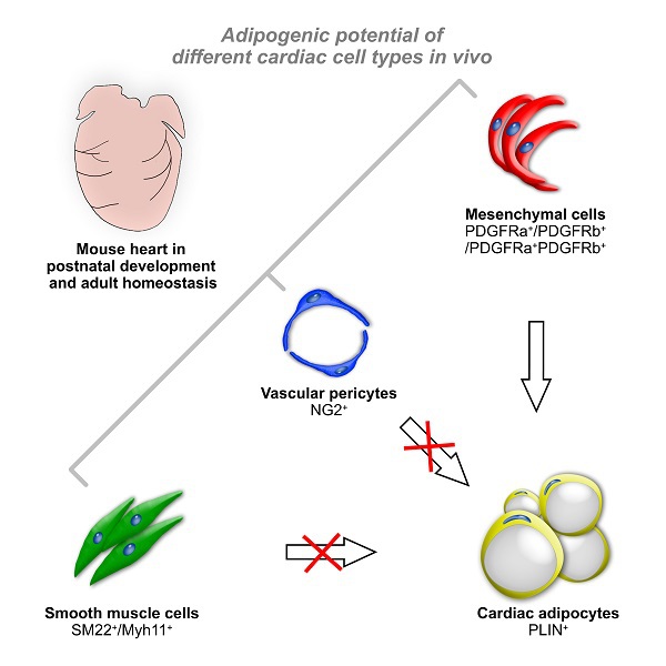 研究人员利用多种遗传工具小鼠对心脏中的多种细胞类型(包括间充质细胞、内皮细胞和血细胞)进行了命运追踪,最终发现PDGFRa+和PDGFRb+间充质细胞是心脏脂肪细胞的祖细胞,且PDGFRb+间充质细胞是心脏脂肪细胞的主要来源。