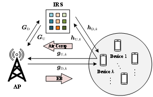 为了解决上述问题,周勇课题组提出了一种基于智能反射表面(IRS)的无线能量传输和空中计算相结合的物联网络。其中,IRS作为一种可通过软件控制信号反射的新技术,能够诱导入射信号产生相位上的变化,从而协同实现反射波束赋形。基于此,课题组提出通过联合优化接入点、IRS以及物联网设备三处的波束赋形来最小化空中计算时接收信号的误差。为此,课题组首先利用交替优化的方式对多变量之间去耦合,再利用凸差算法得到非凸问题下较高质量的次优解。实验结果表明,相较于没有IRS协助的网络,部署IRS能够显著降低空中计算时的误差,为未来网络搭建提供了新思路。