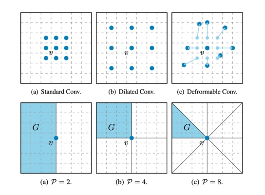 图|第一排为基于点采样的卷积操作。第二排为所提出的地标特征卷积实例