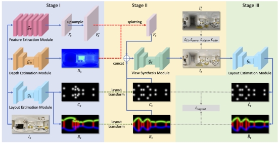 图| 基于房间布局指导的室内全景新视角生成算法框架图