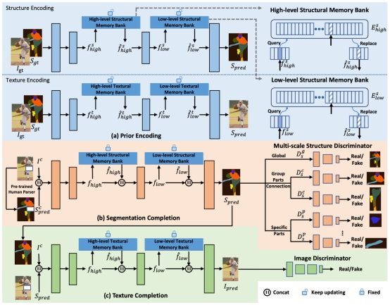 结构先验对于理解图像中的前景与背景有不可或缺的作用,然而大多数现有的图像补全算法并没有显式的利用这一信息,它们大都通过神经网络模型去学习图像中的结构信息。所以本文首先提出了利用人体结构先验——语义分割图来为模型提供人体结构先验,与传统的工作相比,这样的改进不仅对模型进行了结构上的引导,同时也为中间特征提供了丰富的语义信息,使模型可以恢复出合理的人体结构。此外,通过在模型中嵌入精心设计的记忆栈模块来引入结构-纹理相关性先验,与结构先验相呼应,使模型在恢复出合理的人体结构的同时可以进一步恢复出逼真的纹理,从而得到栩栩如生的图像。