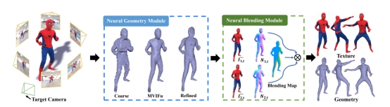 动态人体四维重建和渲染在沉浸式VR / AR体验中至关重要,但现有方法仍旧无法从稀疏的多RGB相机中恢复出精细的几何形状和纹理结果。在这项研究中,课题组首次提出了一种实时的基于神经网络的人体动态捕捉和渲染系统,可以在任意视角下中生成高质量几何和高真实感纹理。该方法首先采用分层采样的策略通过隐式函数的方法实时生成任意视角的深度图,然后使用基于神经网络的纹理融合方法在新视角下生成高分辨率的逼真纹理图像。此外,该方法采用了基于神经网络的法向融合来增强几何细节,并且将几何和纹理渲染建模成一个多任务的学习框架。大量的实验证明了该方法能够高效实现人体动态行为的高质量几何重建和逼真的自由视角渲染。