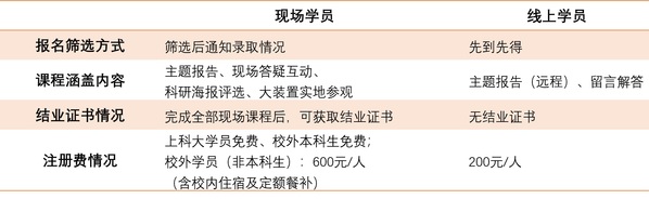 本期暑期学校将采用现场教学与线上听课同时开展的课堂方式,为国内外的莘莘学子提供便捷的学习途径。参与现场教学的学生需经过报名筛选,同时课程模块包含大装置参观及科研海报交流。线上远程旁听的学员以“先到先得”的方式进行报名,可全程听取所有课堂授课。