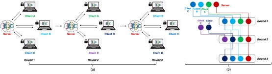 图. (a)三轮通信回合的流程示例。(b)基于(a)的示例生成用于检查横向联邦学习运行过程的概述设计。 连接关系指示相应的节点是否参与下一轮联邦通信。
