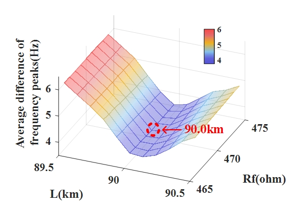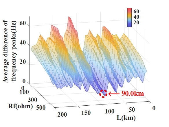 图2. 故障位置求解算法(故障位于90千米处,曲面最低点对应故障定位结果)