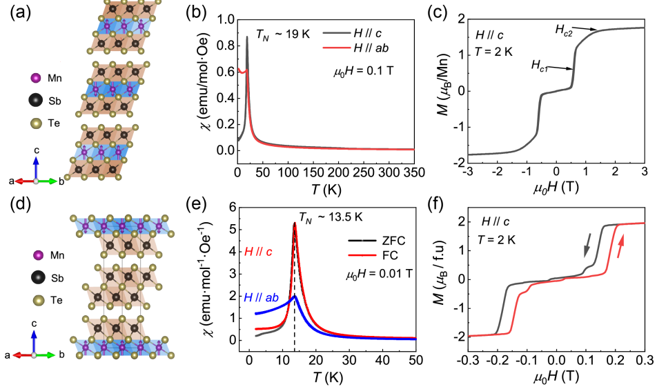 图1:MnSb2Te4(上)及MnSb4Te7(下)晶体结构及其磁性表征结果。