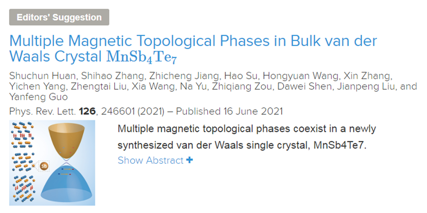 近期,我校物质学院郭艳峰、刘健鹏研究组与合作者在磁性拓扑材料探索方向取得重要进展,相关成果以题为“Multiple magnetic topological phases in bulk van der Waals crystal MnSb4Te7”发表于国际著名期刊Physical Review Letters,并被选为编辑推荐论文(Editor’s Suggestion)。