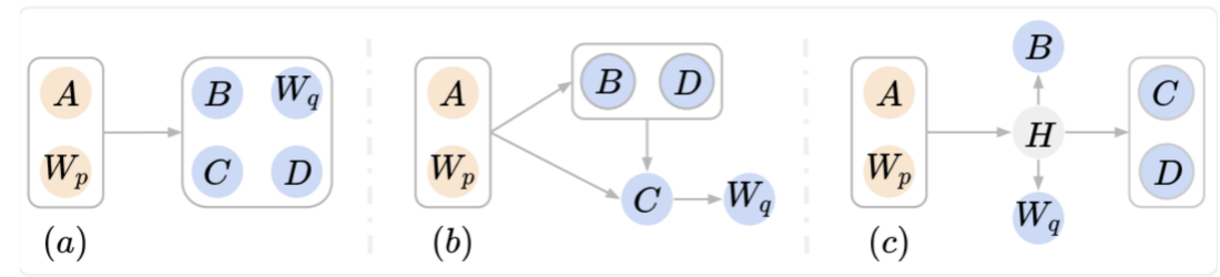 图| 原始的双词汇化PCFG(左),之前的工作(中),该论文提出的参数化方式(右)