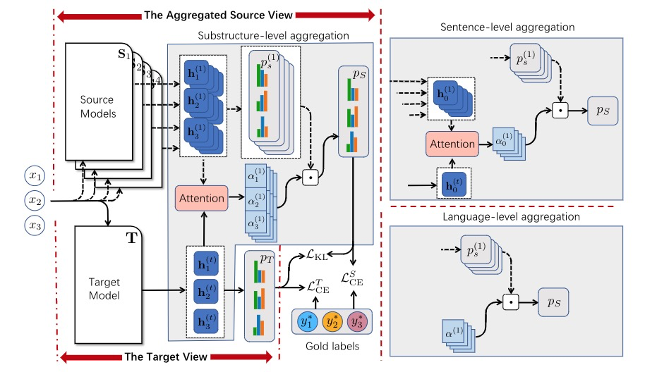 在主会论文Multi-View Cross-Lingual Structured Prediction with Minimum Supervision中,课题组研究了多个源语言同时目标语言只有少量标注数据的跨语言结构预测。他们提出了一个多视图框架,通过利用少量已标注的目标语言的句子,在不同的粒度(语言、句子或子结构)上将多个源模型有效地结合成一个聚合的源视图,并将其知识迁移到基于特定任务模型的目标视图。通过鼓励两个视图相互作用,论文提出的框架可以动态地调整每个源模型的置信度,并在训练期间提高两个视图的性能。屠可伟课题组2019级硕士生胡泽川是本文的第一作者,阿里巴巴达摩院为合作单位,屠可伟教授为通讯作者。
