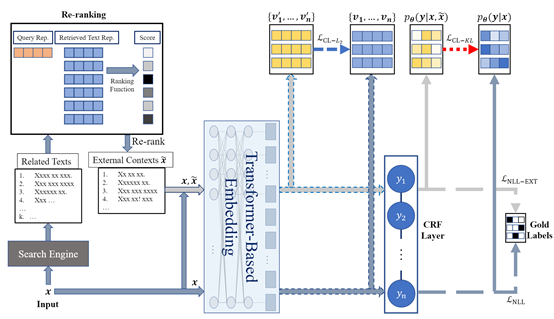 在主会论文Improving Named Entity Recognition by Retrieving External Contexts and Cooperative Learning中,课题组研究了利用检索信息和合作学习的方式来提高命名实体识别的效果。命名实体识别的最新进展表明,文档级上下文可以显著提高模型性能,但许多场景中并没有这样的上下文。研究人员提出以原始句子为搜索输入,通过搜索引擎检索和选择一组语义相关的文本来作为句子的外部上下文。此外,课题组还提出可以通过合作学习来同时提高有和没有上下文两个输入视角的性能,即鼓励两个输入视角产生相似的上下文表示或输出标签分布。屠可伟课题组2020级博士生王新宇是本文第一作者,阿里巴巴达摩院为合作单位,屠可伟教授为通讯作者。