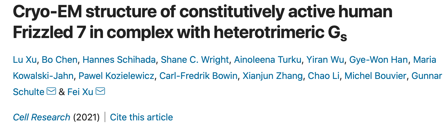 上科大iHuman研究所徐菲课题组在癌症药物靶点卷曲受体研究上再传捷报,继2018年在Nature上发表第一个卷曲受体FZD4结构,其研究团队又通过冷冻电镜技术首次解析了卷曲受体FZD7和下游G蛋白三聚体复合物结构,以真实可见的三维精细结构破解了卷曲受体领域长期争论的谜题——即此类非经典G蛋白偶联受体(GPCR)能否与G蛋白形成稳定的具有信号传递功能的复合物。该成果以“Cryo-EM structure of constitutively active human Frizzled 7 in complex with heterotrimeric Gs”为题,于7月8日在学术期刊《细胞研究》(Cell Research)上在线发表。