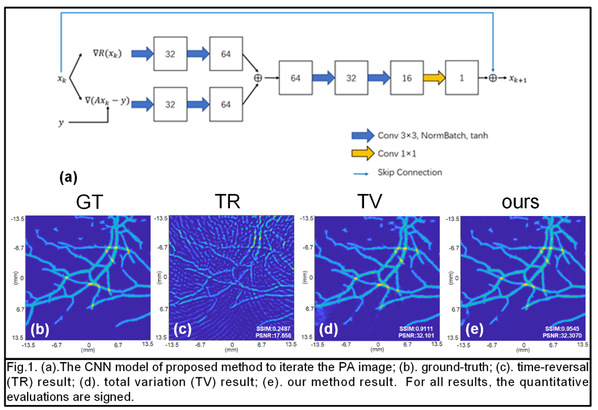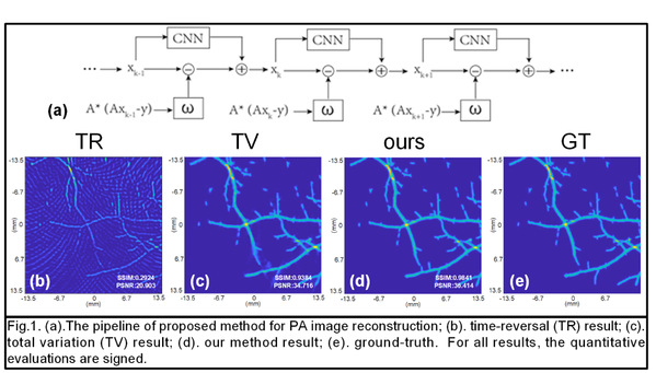 生物医学工程专业大三本科生李卓安提出一种在基于模型的光声图像重建中使用深度学习的方法来代替复杂的参数调整过程,并通过构建卷积神经网络来加快收敛速度。模型中定义的参数可以自动学习,在每次迭代中不断优化。实验表明与传统的光声图像重建方法相比,本方法可以显著提高图像重建的效率。论文题为“Learned Parameter and Increment for Iterative Photoacoustic Image Reconstruction via Deep Learning”。