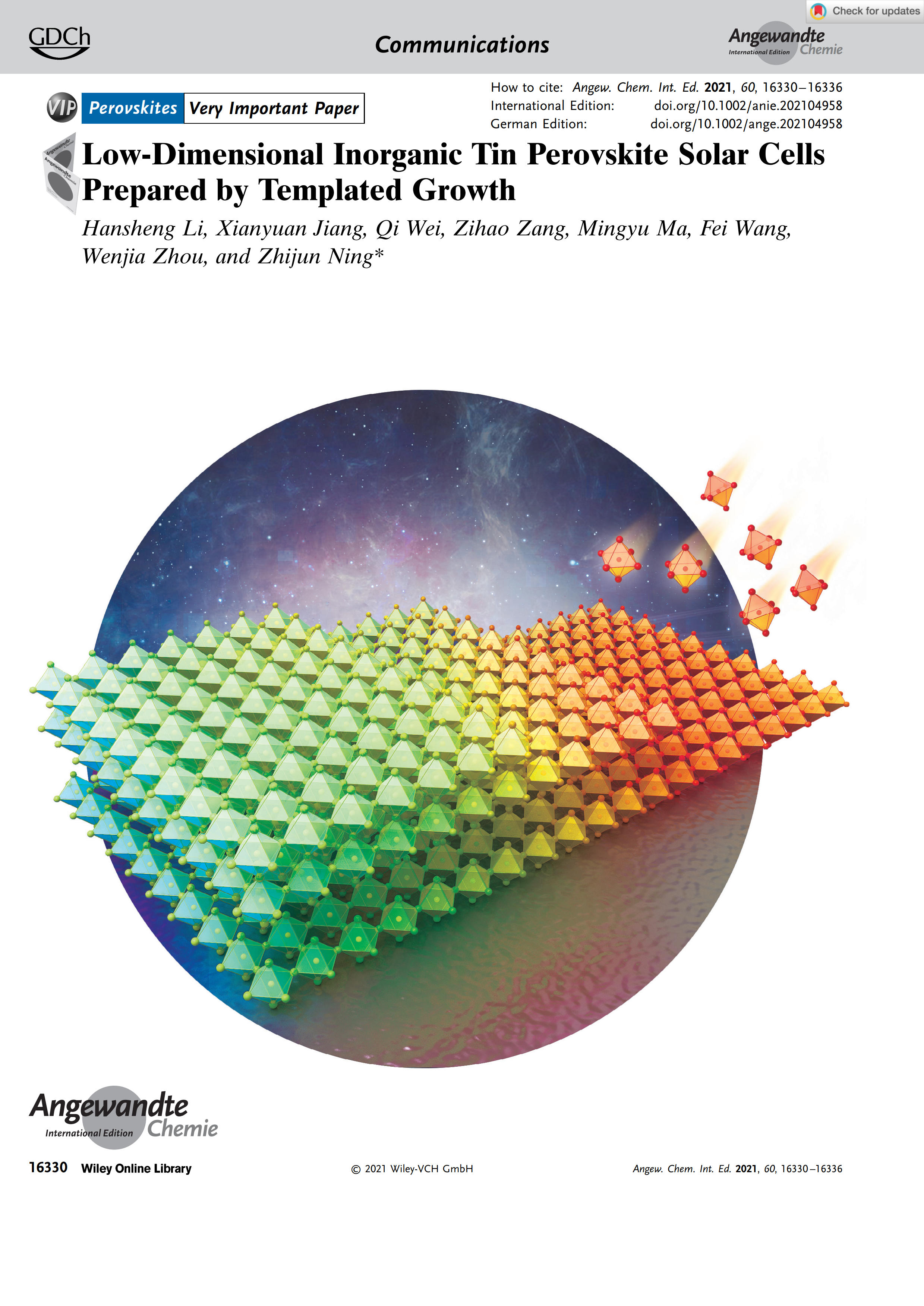 近日,九游体育(www.jiuyou.com)官方网站物质学院宁志军课题组提出一种以低维钙钛矿诱导三维钙钛矿生长的方法,并基于该方法制备出了低维无机锡钙钛矿太阳能电池。相关研究成果以“Low-Dimensional Inorganic Tin Perovskite Solar Cells Prepared by Templated Growth”为题发表于国际学术期刊《德国应用化学》(Angewandte Chemie International Edition)。该项工作入选了Angewandte Chemie International Edition的Very Important Paper (VIP),并作为封面文章进行Highlight,期刊也对作者宁志军教授进行了专题介绍(https://onlinelibrary.wiley.com/doi/10.1002/anie.202107321)。
