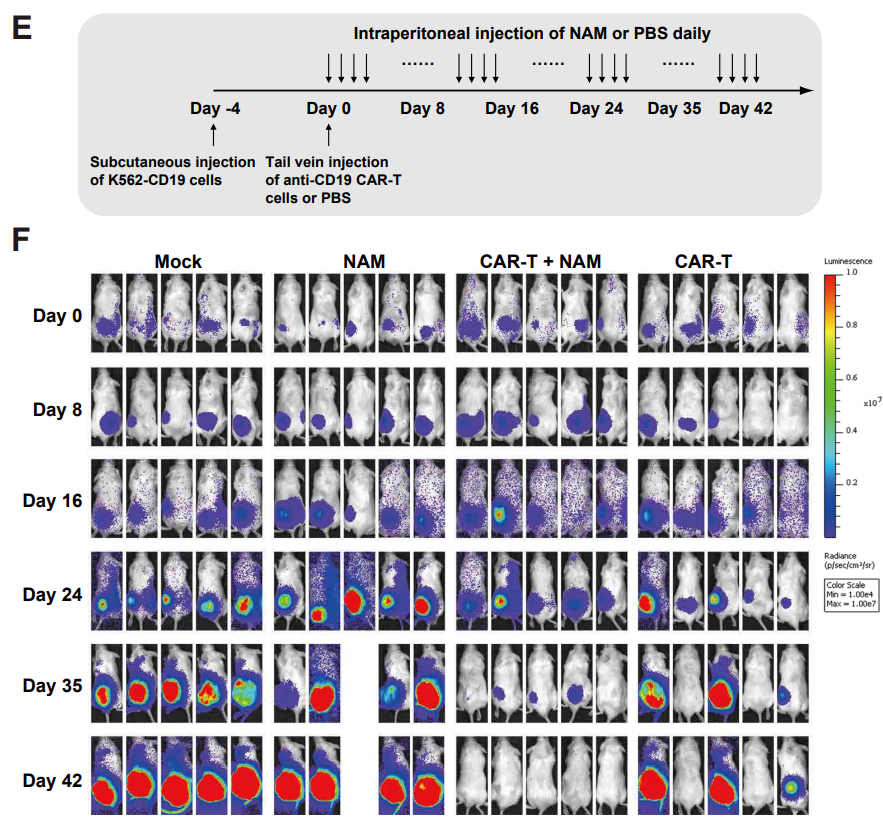基于NAD+在T细胞活化中的重要作用,作者进一步在CAR-T肿瘤治疗模型和Anti-PD1肿瘤治疗模型中进行了临床前试验,证明了补充NAD+可以在多种动物模型中显著提高基于T细胞的免疫治疗的抗肿瘤杀伤活性(图3)。