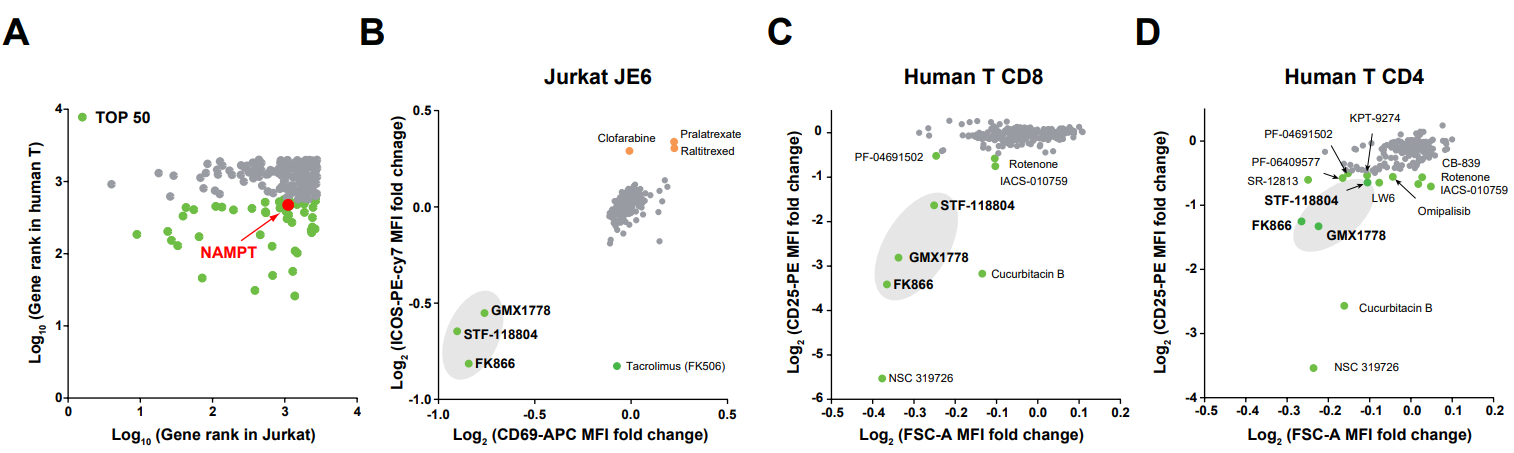 通过全基因组sgRNA筛选实验以及高通量代谢抑制剂筛选实验发现,烟酰胺磷酸核糖转移酶(NAMPT)介导的NAD+补救途径是T细胞活化所必需的(图1)。外周血T细胞与肿瘤浸润T细胞(TIL)内NAD+水平相对较低。与此相一致,NAMPT在TIL中的水平也很低。进一步的研究表明,NAMPT的表达水平由转录因子Tubby动态控制,而Tubby的活性依赖于TCR-PLCγ信号轴。