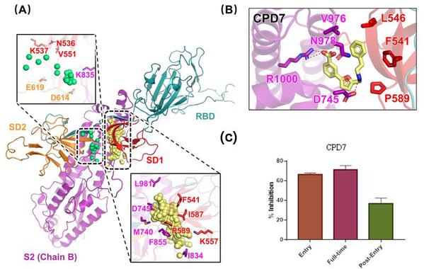 图2. A-B)刺突蛋白潜在变构抑制剂设计位点与苗头化合物预测结合模式。 C)代表性苗头化合物的抗病毒分子作用机制。