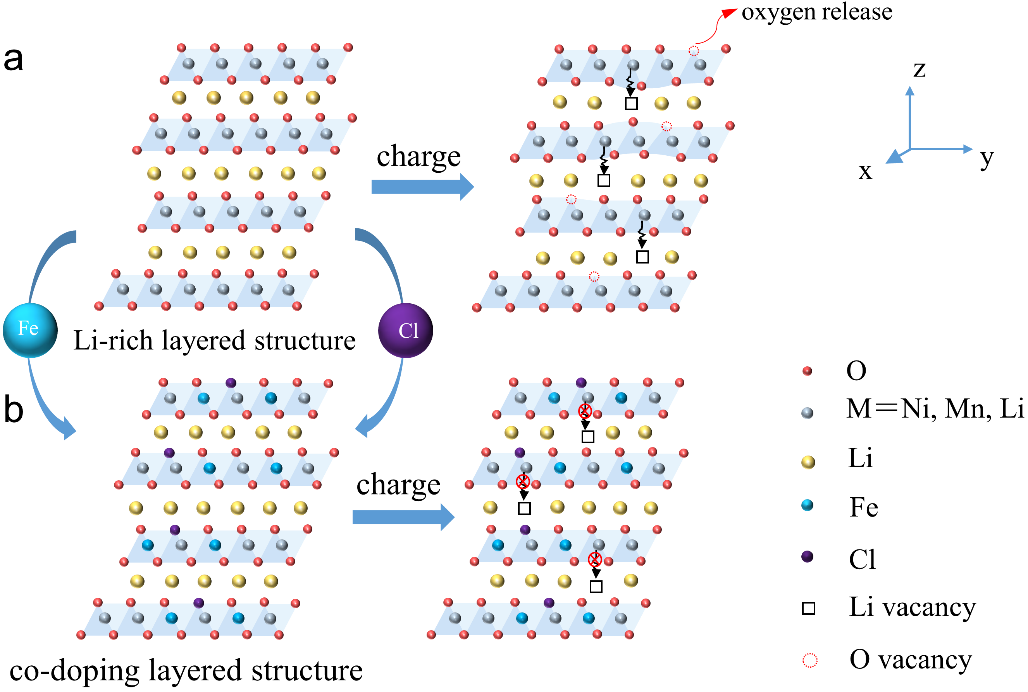 图. 富锂材料中阴阳离子共掺杂的过程及其作用机理示意图