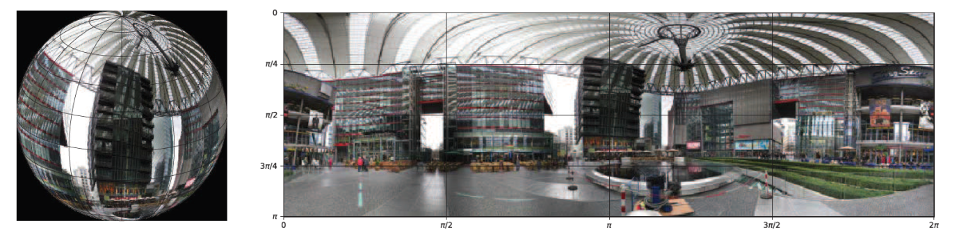 近些年来,360度全景图像或视频因其带给观察者身临其境的观看体验而引发越来越多的关注。但全景图像或视频是一种非欧几里得数据,即这些数据实际上是以二维数据的形式进行存储。人们需要用等矩阵映射(equirectangular projection)把数据从球面映射到平面如下图。等矩阵映射是一种简单的投影方式,它将经线映射为恒定间距的垂直线,将纬线映射为恒定间距的水平线,这就导致二维数据形式存储的360度全景图相比于人们真实感知的场景具有相当大的失真。因此,基于360度全景图像视频理解需要考虑这些投影失真,以便提升图像理解的性能。