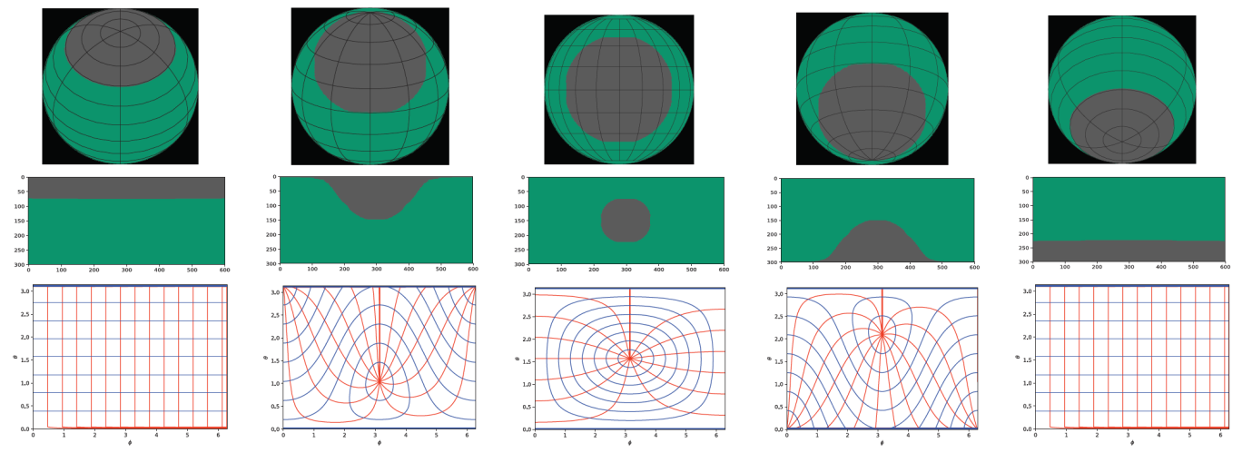 课题组所提出的球状卷积的参数共享示意图。该图显示球冠是如何从北极点(第一列)经过赤道(第三列)然后移动到南极点(第五列),两列之间角度差等π/4。第一行显示的是在原始球面上球冠的区域。第二行显示的是在经过映射变换之后的全景图像上球冠的区域。第三行显示的是与每个球冠卷积核位置相对应的采样网格。红色曲线代表θ方向的采样网格,蓝色曲线代表Φ方向的采样网格。