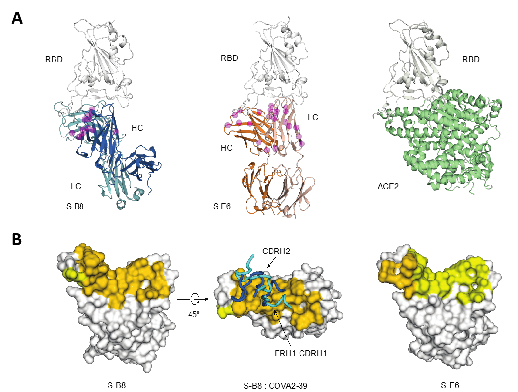 九游体育(www.jiuyou.com)官方网站免疫化学研究所杨光课题组和Richard A. Lerner 课题组针对SARS-CoV-2 S蛋白受体结合域 (S-RBD),利用表位导向方法对构建于20年前的全人源天然组合抗体库开展了多轮竞争筛选,并获得了3个针对S-RBD的高特异性、高亲和力的单克隆抗体。这些抗体分子在假病毒中具有强而有效的中和活性。William James团队证实,这些抗体在活病毒及其突变体中也具有高效的中和活性。Ian A. Wilson团队通过X射线晶体衍射技术,解析了它们的分子作用机制。通过分析抗体SHM突变发现,组合抗体库发现的抗体含有大量SHM突变,而且这些SHM突变残基在与SARS-CoV-2 RBD结合中起关键作用。实验证明,消除S-E6抗体重链CDR1区的SHM突变导致S-E6亲和力的大幅降低。这种由SHM产生的强结合氨基酸序列,揭示了组合抗体库和人体内免疫系统一样,在抗原刺激下,可以通过相似的进化策略,产生有效的抗原识别序列。这一现象对研究病毒与宿主的相互作用及其协同进化具有重要的价值。这些抗体的发现揭示了新冠病毒与人类长期共存的可能性。
