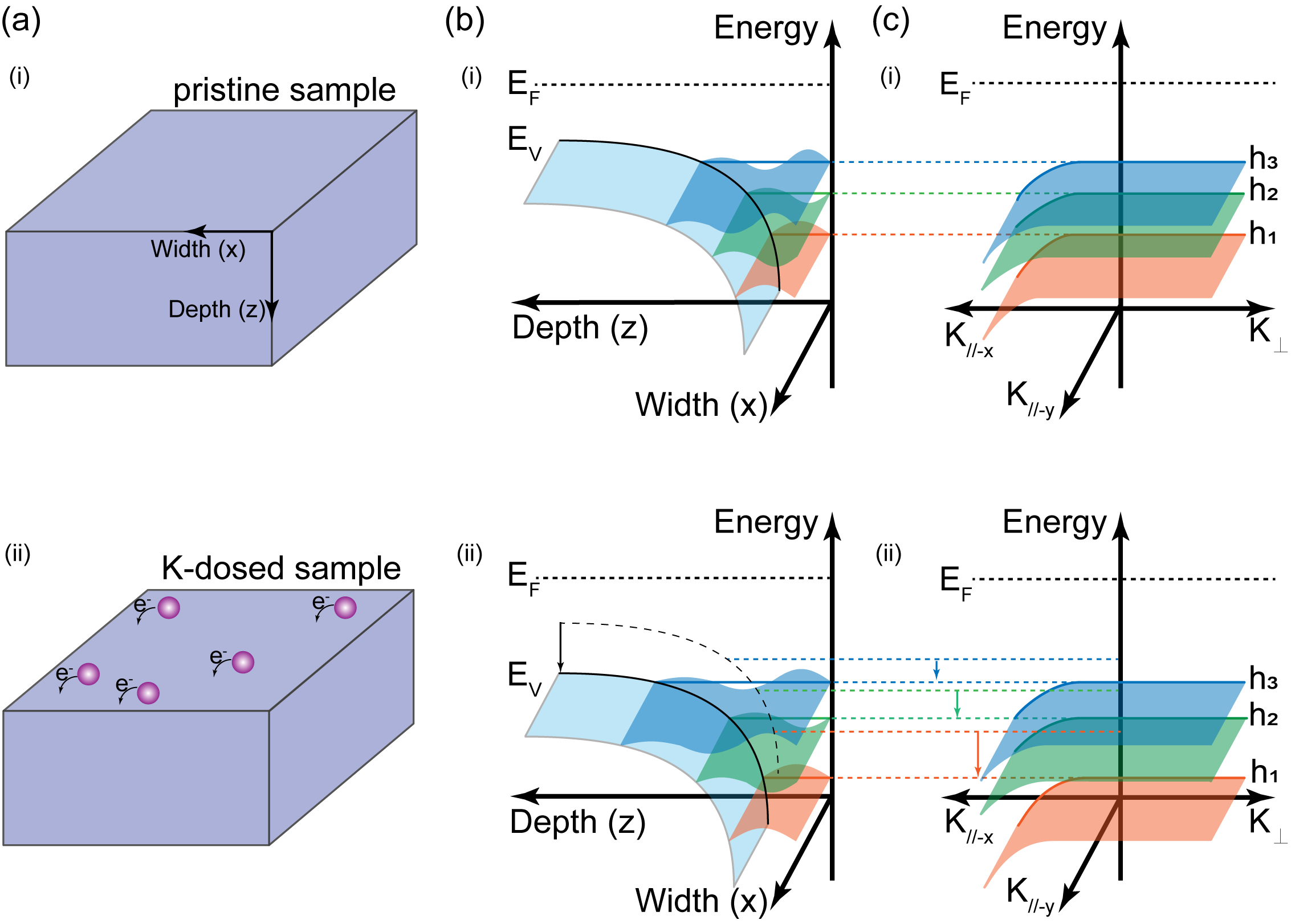 Nb2SiTe4表面量子阱电子态示意图。(a)半导体样品/真空表面(i)及掺K后样品/真空表面(ii)。(b)K掺杂前后Nb2SiTe4量子阱态在样品表面附近分布的示意图。纵轴为能量,横轴为宽度(x)与距离表面深度(z)。(c)K掺杂前后Nb2SiTe4量子阱态在动量空间的示意图。纵轴为能量,横轴为水平方向动量。