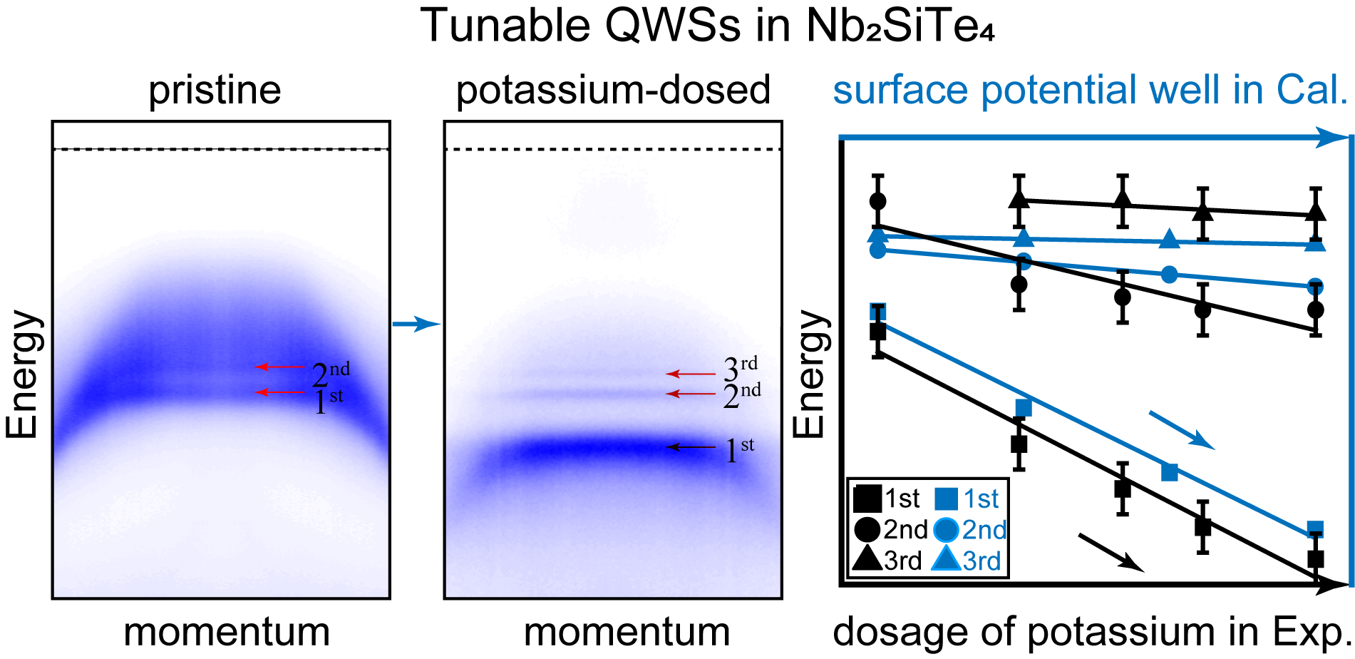 Nb2SiTe4量子阱电子态的实验测量与调控。左图,通过角分辨光电子能谱测量得到Nb2SiTe4表面量子阱态。箭头所示为不同分立能级。中图,表面钾原子掺杂后实现调制的Nb2SiTe4量子阱电子态。箭头所示为对应左图的不同分立能级。右图,实验测量分立能级随钾原子掺杂量演化(黑色)与理论计算(蓝色)对比。