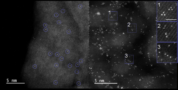 图(左)低负载量和(右)高负载量催化剂的ADF-STEM图像