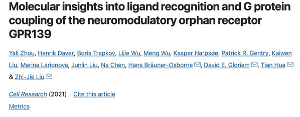 抗精神分裂症阴性症状机理以及阿片类药物的用药安全性一直是亟待解决的科学问题。孤儿受体GPR139是在大脑中高度表达的G蛋白偶联受体(G protein-coupled receptor, GPCR),其与μ阿片受体和多巴胺受体(D2R)的表达具有高度相关性,并且参与机体调节及运动代谢等基本生命活动。研究表明GPR139与精神分裂症、帕金森症、酒精成瘾等众多中枢神经系统疾病的发生和发展密切相关。目前已有针对GPR139的激动剂小分子TAK-041进入临床I期试验,用于治疗精神分裂症阴性症状。同时研究也发现GPR139对μ阿片受体的信号具有负向调控作用,GPR139的拮抗剂有望提高阿片类药物的用药安全性。因此,GPR139的配体调控及信号转导分子机制研究对未来的基础和转化研究具有非常重要的指导意义。