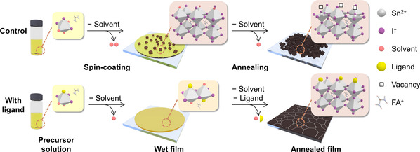 图. 锡基钙钛矿材料在涂膜过程中容易快速结晶,产生杂乱无章和多缺陷的晶粒(上排),而此研究工作开发的含硫配体(黄色球)能够有效地延缓结晶过程,得到平整致密、表面缺陷被抑制的锡基钙钛矿薄膜。