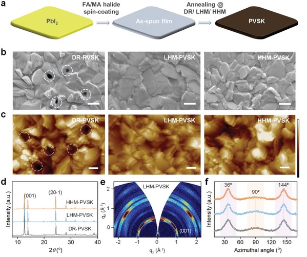 在另外一项近研究中,陈刚团队揭示了在潮湿条件下退火对甲脒基钙钛矿薄膜品质的提升作用,并应用先进同步辐射技术研究了其内在机制。甲脒基钙钛矿材料具有制备高效商业太阳能电池的巨大潜力,然而此类薄膜需要在严苛的环境下加工,阻碍了其商业化进程。陈刚团队系统地研究了在环境条件下退火制备甲脒基钙钛矿薄膜的过程。在低湿度条件下制备的薄膜比在无湿条件下制备的薄膜具有更少的针孔和缺陷,并表现出更好的器件性能。一系列原位和准原位研究揭示了低湿度条件下退火过程中,水分子和钙钛矿之间的相互作用引发的钙钛矿薄膜缺陷不断地愈合(图二)的现象。该研究将进一步推进甲脒基钙钛矿太阳能电池的环境制备和相关器件的实用化发展。该成果以“Humidity-Induced Defect-Healing of Formamidinium-Based Perovskite Films”为题,发表于国际知名期刊Small。