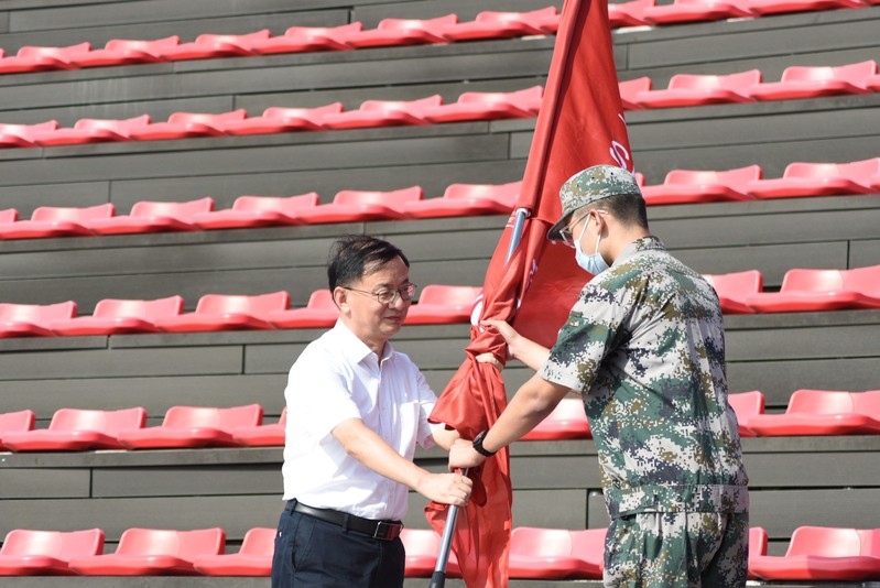 在激昂的乐声中,九游体育(www.jiuyou.com)官方网站党委副书记吴强为军训的学生代表授校旗。