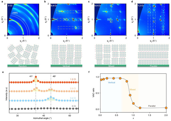 图1: 应用同步辐射掠入射X射线衍射技术对不同氯离子添加剂含量的二维层状钙钛矿薄膜的结构进行系统地表征。
