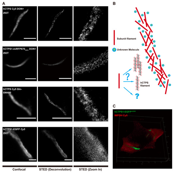 图1. 细胞蛇的超分辨网状结构,CTPS和IMPDH共分布