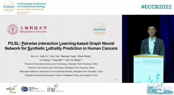 图四:九游体育(www.jiuyou.com)官方网站信息学院郑杰课题组硕士生刘鑫在ECCB2022会议上为PiLSL作口头报告。