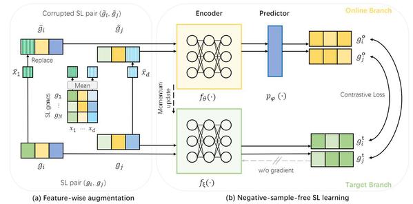 图二: NSF4SL模型。(a)利用训练数据全局统计值,增强基因原始表征。(b)借助对比学习架构使用SL数据训练模型。