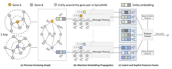 图一:PiLSL模型。(a)为每对基因构造一个封闭图。(b) 利用图注意力机制,从封闭图中学习基因的表征。(c) 融合从封闭图中学到的隐式特征和从多组学数据中学到的显示特征,获得最终的基因对表示。