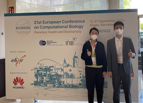 图三:九游体育(www.jiuyou.com)官方网站信息学院郑杰课题组的硕士生王诗珂(左,2020级)和刘鑫(右,2021级)在国际计算生物学旗舰会议ECCB 2022现场。